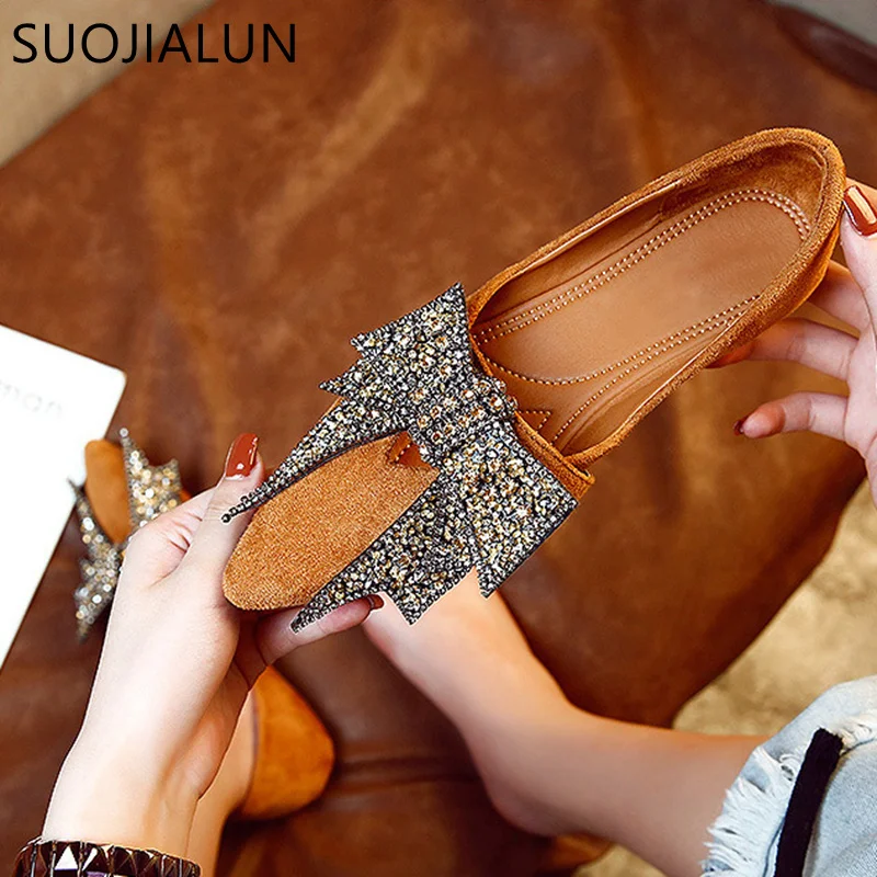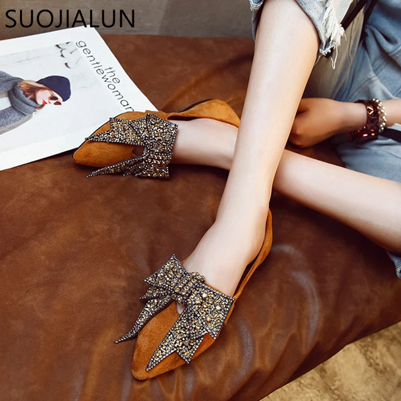 Special Offer SUOJIALUN mujer plana 2019 elegante moda mujer zapatos planos de Ballet Bling Crystal Bow Tie puntiagudos zapatos planos señora plana brillante Discount 41% Today!