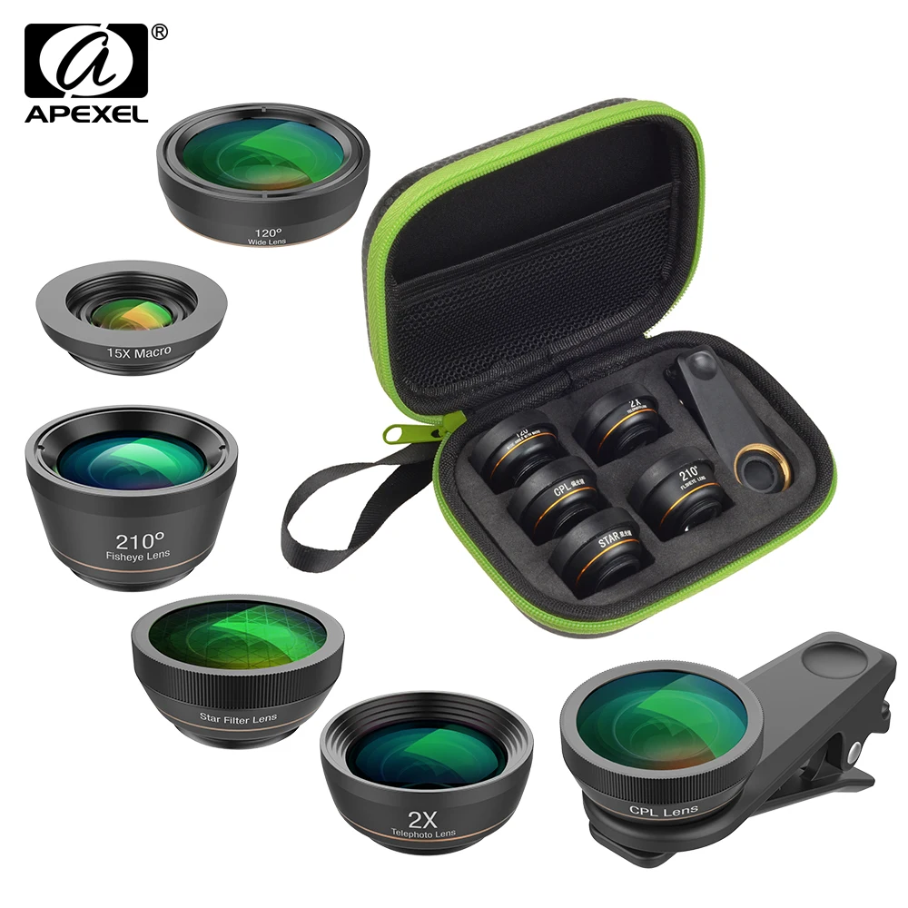 Special Offer APEXEL teléfono Kit de la Lente de la Cámara de 6 en 1 lente ojo de pez 210 grados de ángulo ancho lente Macro CPL filtro estrella 2X tele para teléfonos inteligentes Discount 37% Today!