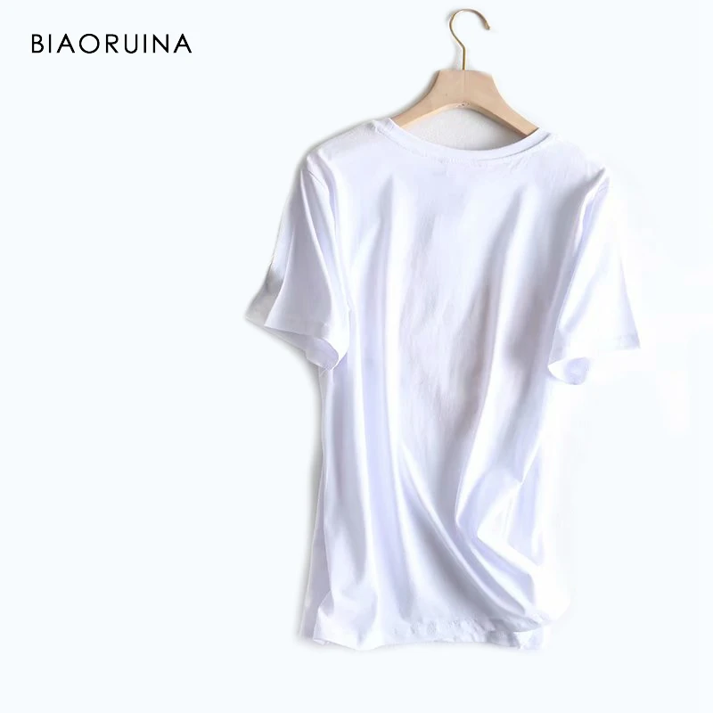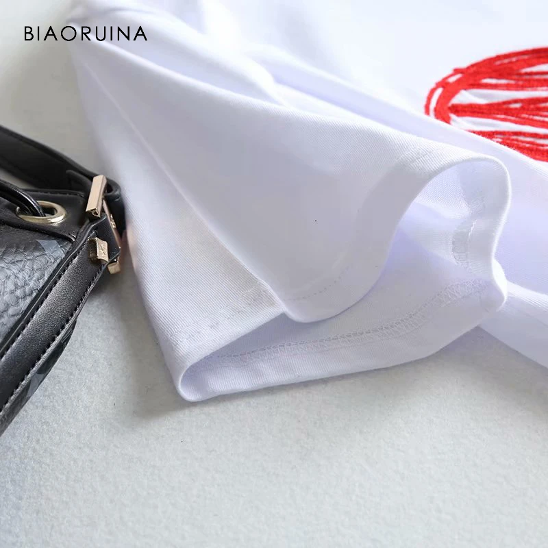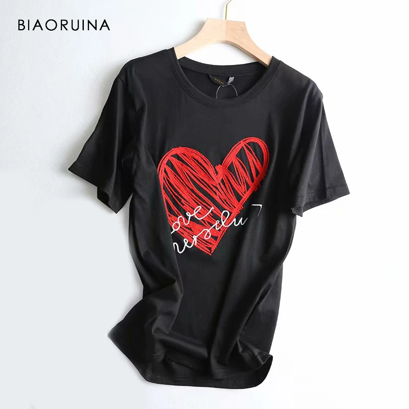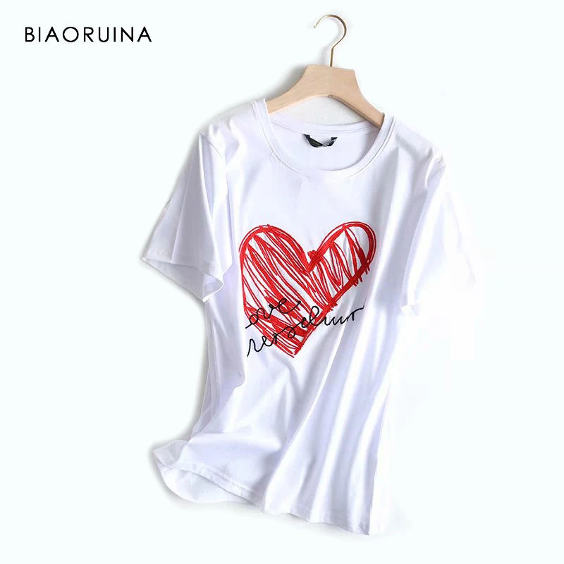 Special Offer BIAORUINA mujer Casual bordado corazón letra camiseta algodón camisetas moda mujer todo fósforo manga corta Camiseta cuello redondo Discount 51% Today!