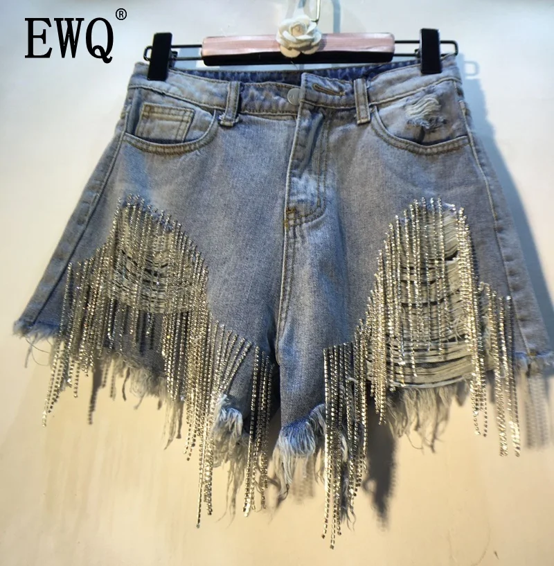 Special Offer [EWQ] 2019 pantalones cortos vaqueros de cintura fina de alta combinación con cuentas de diamantes de uñas con borlas pesadas para Primavera Verano de 2019 a32305 Discount 49% Today!